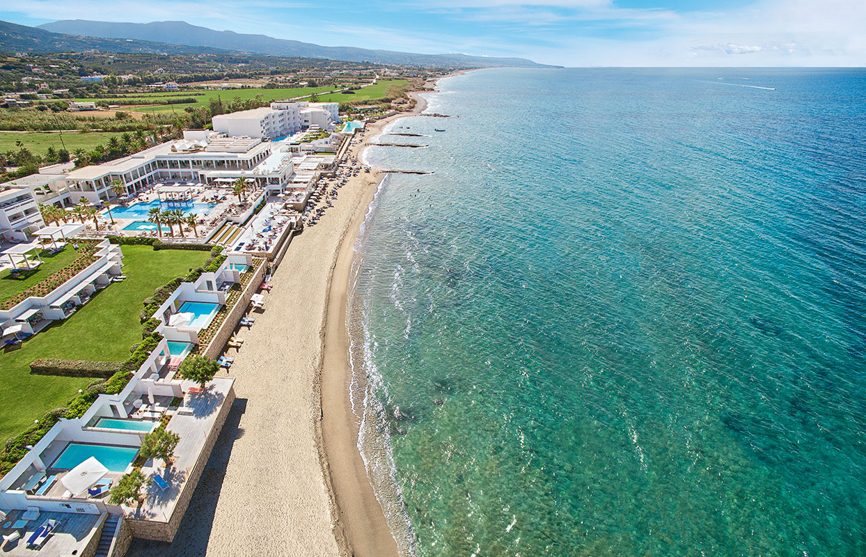 Ένα συγκλονιστικό μπαλκόνι στη θάλασσα, όλο το ξενοδοχείο, με τις βεράντες, τους κήπους, τις πισίνες του, κρεμασμένες στο Κρητικό Πέλαγος. Από το δωμάτιο ακούγεται η θάλασσα και ο ήλιος δύει αυτοκρατορικά μπροστά στα μάτια σου όλο το καλοκαίρι. Τόσο ροζ και τυρκουάζ το ηλιοβασίλεμα. Με μοναδική, ζωντανή ατμόσφαιρα, εξαιρετικό φαγητό και ανεπιτήδευτο αέρα, προσφέρεται για τέλειες οικογενειακές διακοπές.